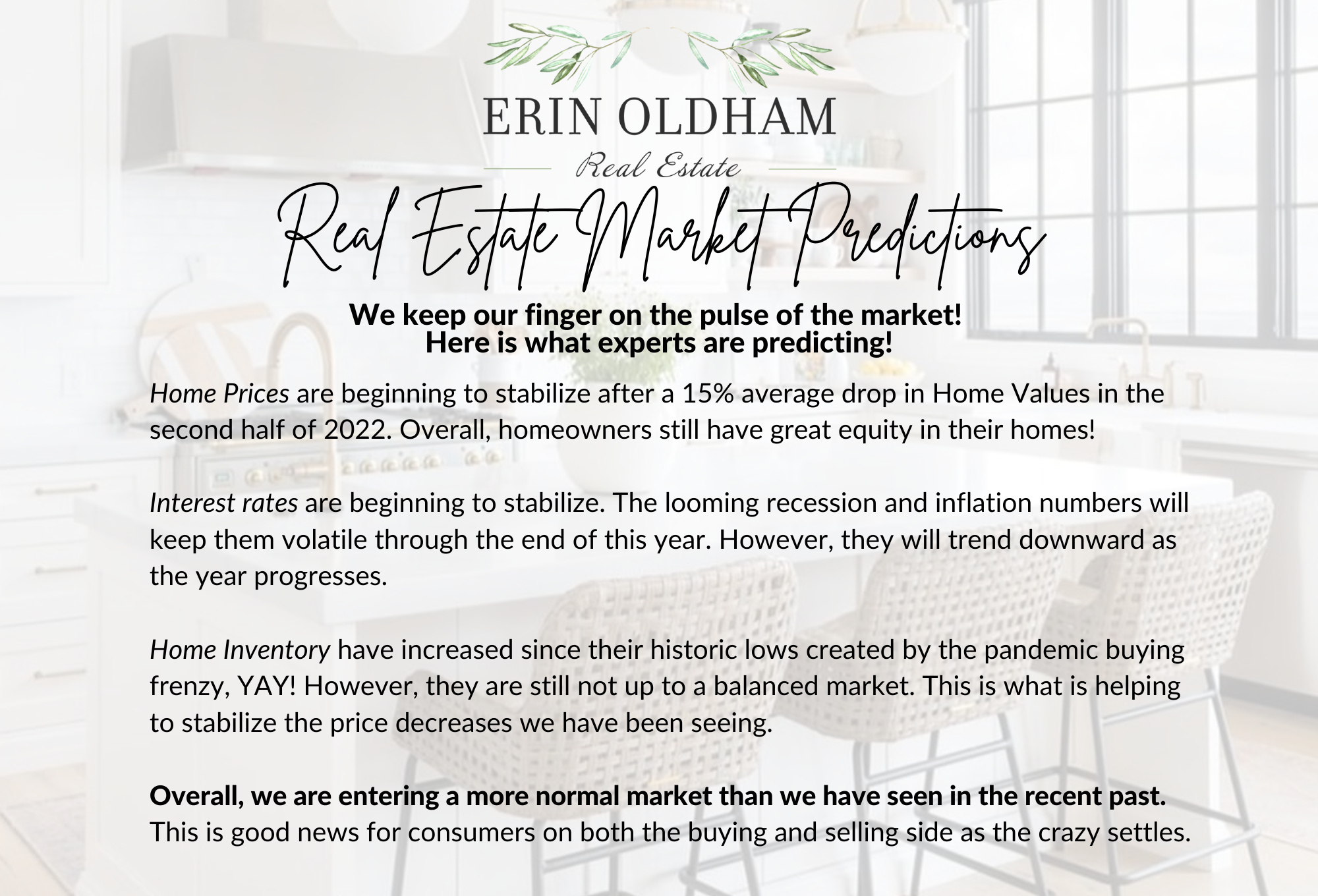 Now, as we step into this new year, we are starting to see the dust settle. Based on all the research we do and experts we follow and learn from, we are expecting to see the inventory continue to hit the market, both in new construction and in resale. We are expecting current home owners to still have amazing equity in the homes they own. Prices have leveled out and will increase/decrease slightly based on the location and style of the home itself. Life still happens and the world still is spinning. The many reasons that people buy and sell real estate still exist.